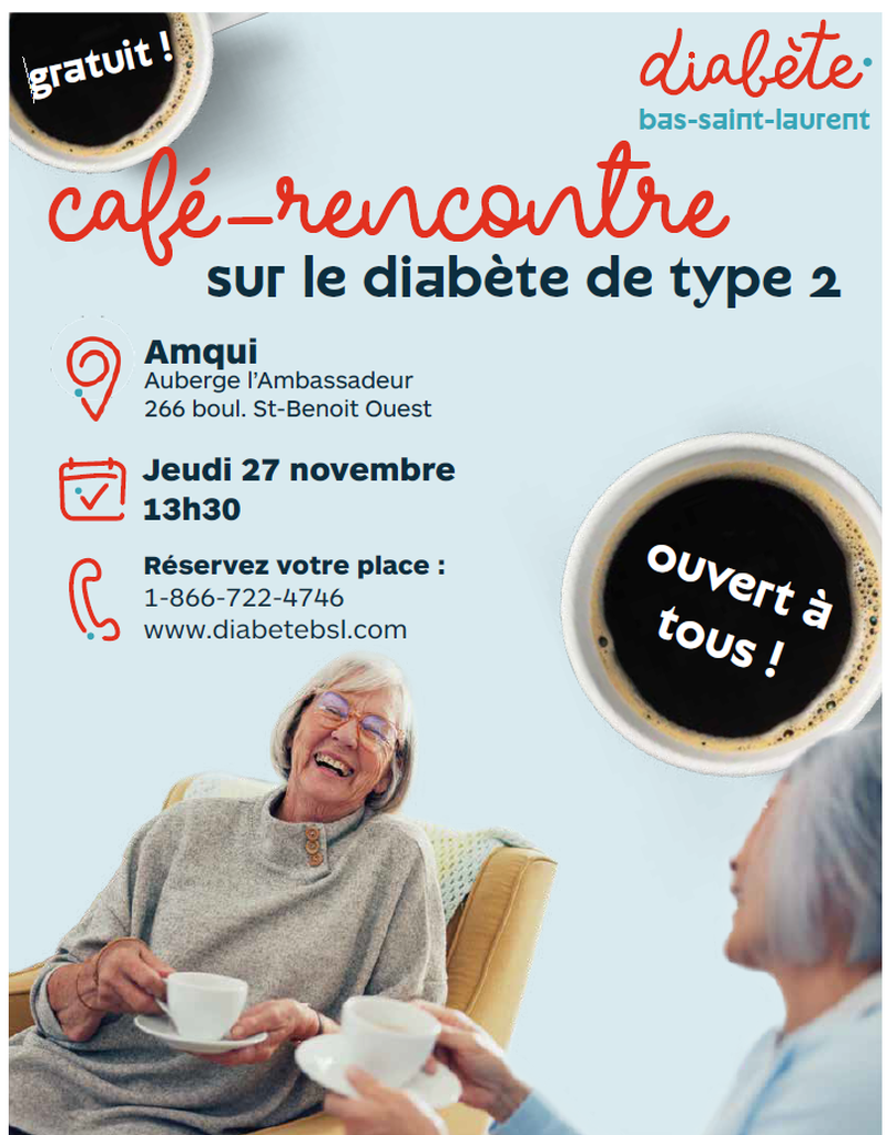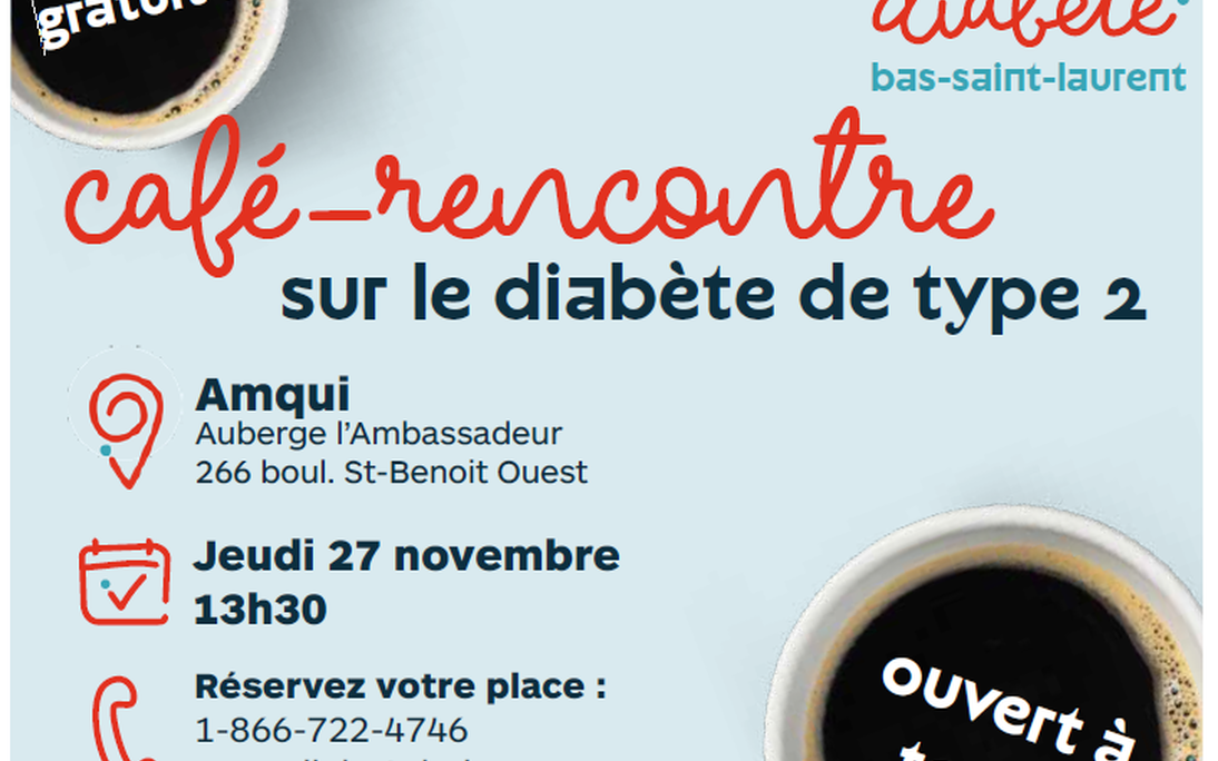 Dans le cadre du mois du diabète, Diabète Bas-Saint-Laurent tiendra un café-rencontre à Amqui le jeudi 27 novembre à 13h30 à l'Auberge Ambassadeur.